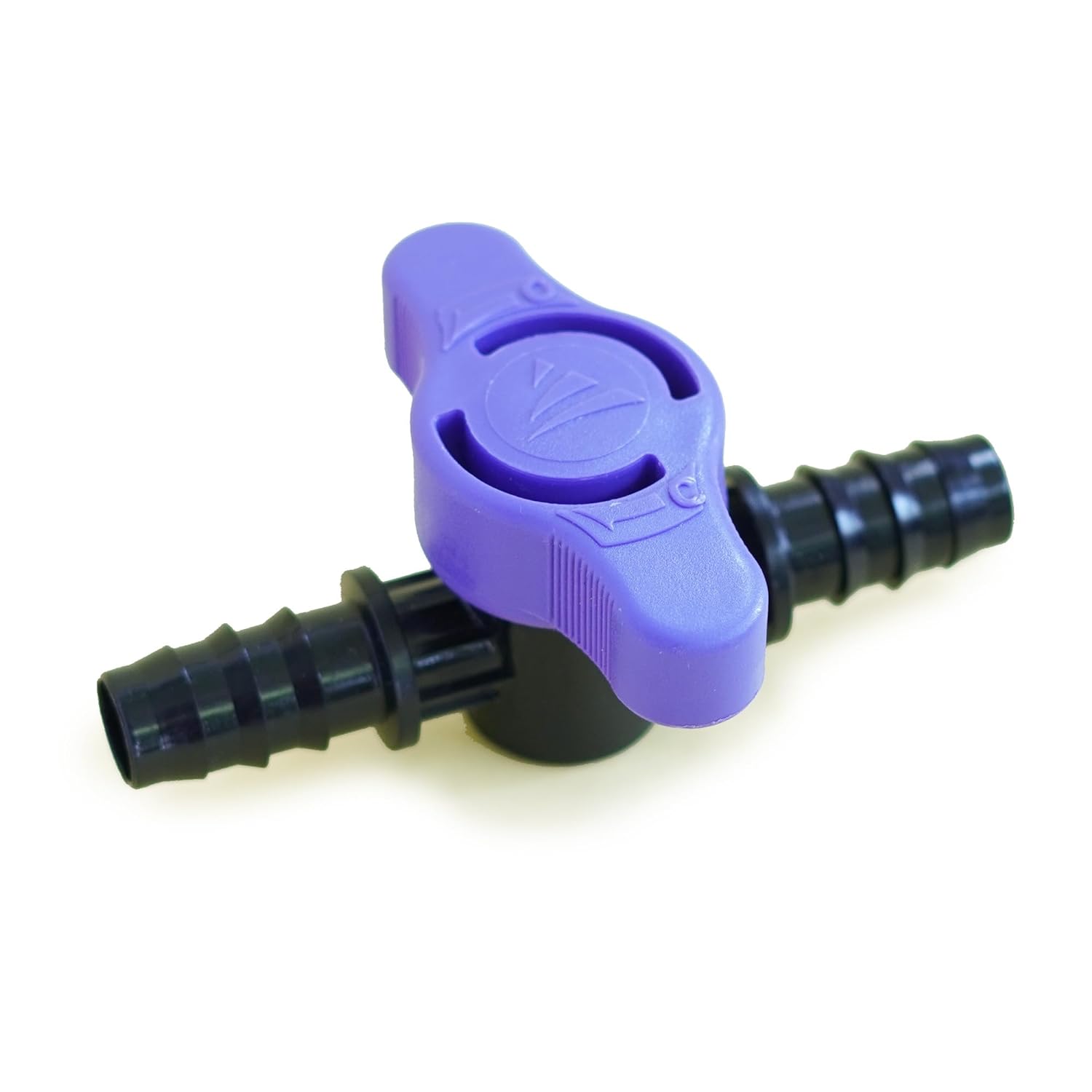 16mm Heavy Duty Lateral Cock Valve, Pack of 5, Leak Proof, Large Handle, Black/Violet, Drip irrigation Pipe Fittings (5). This robust lateral cock valve is specifically engineered for agricultural drip irrigation systems. Constructed from high-quality, durable materials, it boasts a 16mm leak-proof design and a large handle that facilitates easy operation, even when wearing gloves. Its distinctive violet and black color scheme enhances visibility, allowing for rapid identification in the field. Ideal for managing water flow, the valve is straightforward to install. To ensure a secure, leak-free fit, simply press the tubing firmly onto the barbs. For an even easier installation, the tubing's end can be softened using a heat gun or blow dryer before insertion. Built to withstand regular usage and the rigors of outdoor conditions, this valve is an economical solution for precise water distribution in drip irrigation lines across expansive farms and plantations.