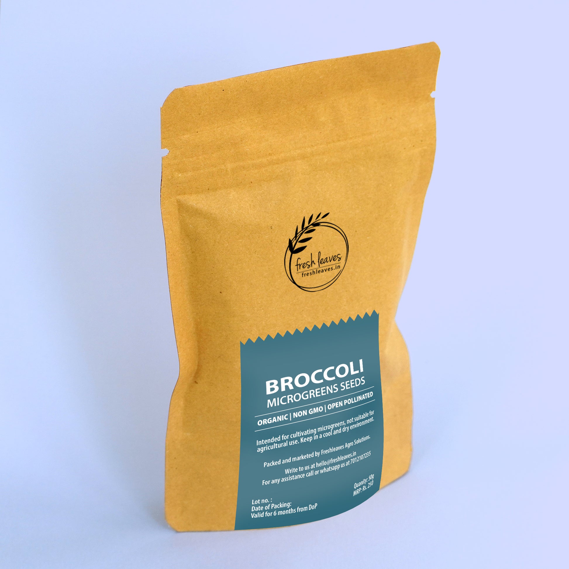 The package includes 50 gm of non-treated, open-pollinated BROCCOLI seeds known for their high germination rates.