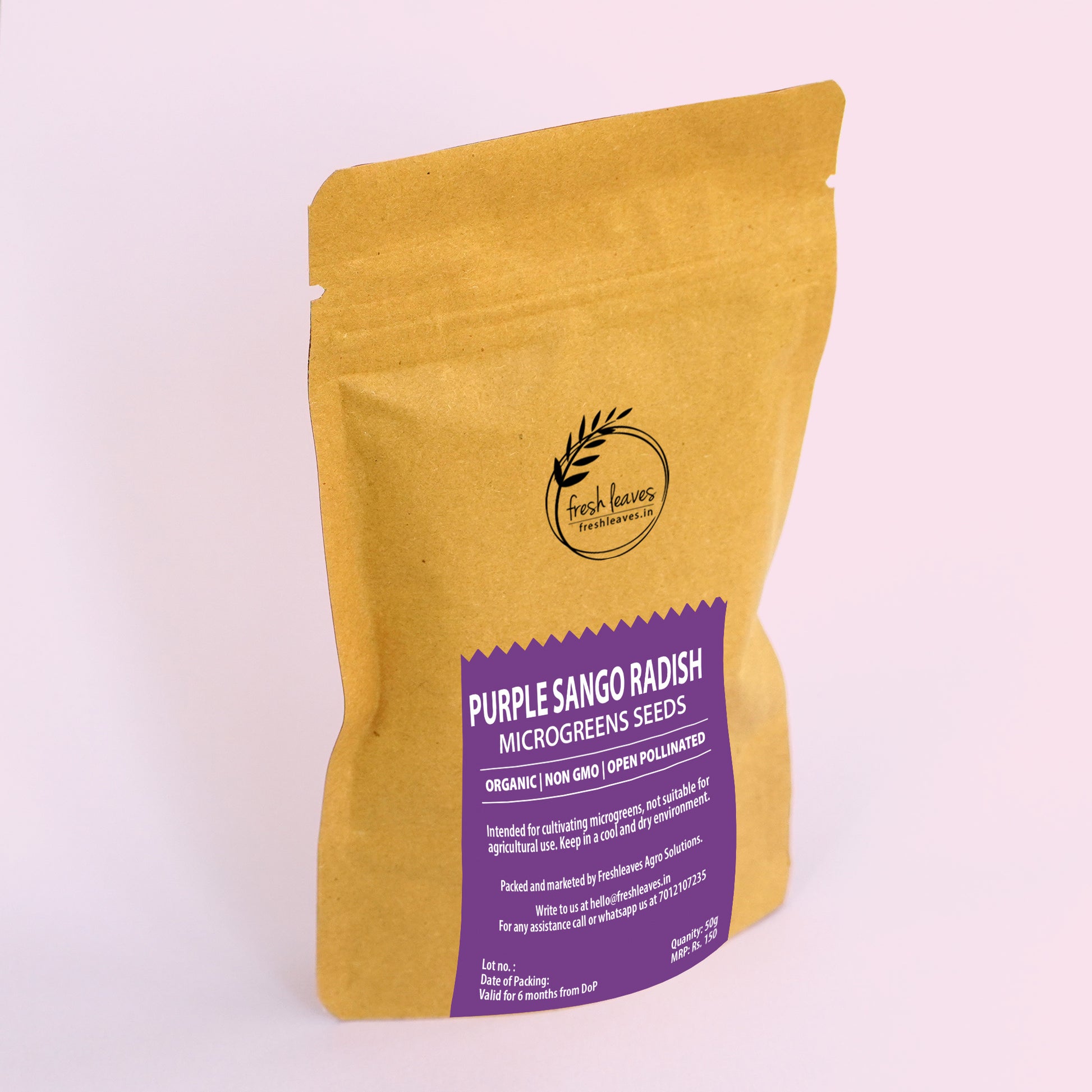 The package includes 50 gm of non-treated, open-pollinated Purple sango radish seeds known for their high germination rates.